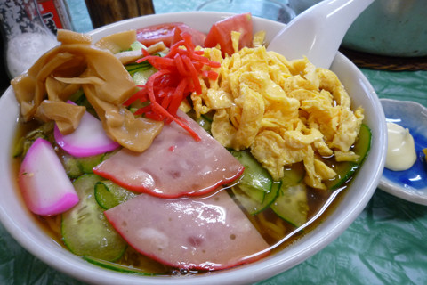 冷やし中華(並・¥650)、皿ではなく鉢、スープもなみなみと (^^;