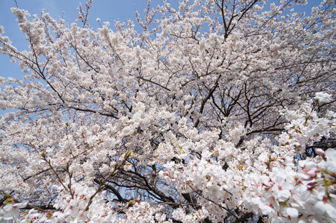 さっそく花見、そろそろ満開かな、広角レンズで青空を入れて撮るのが好み。