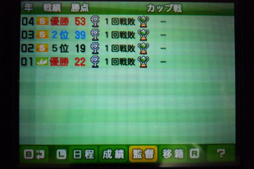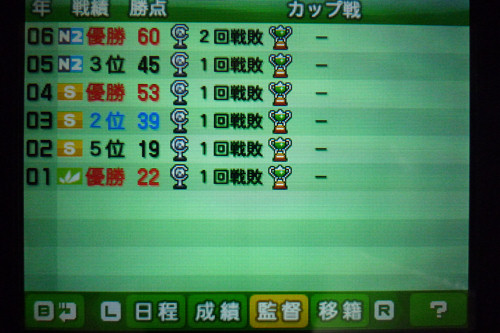6年目終了、19勝3分6敗、優勝しちゃいましたね (^^;