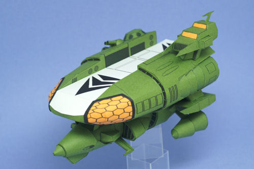 色画用紙で作る宇宙戦艦7号、某帝国の主力空母、2年前に8割ほどモデリングしてほったらかしになってたのを完成させました。あの映画を象徴するメカですね、曲線多用の優美なデザインが好みです。今回も fg です。