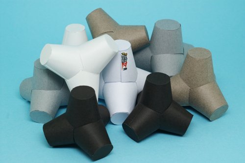 作者さま同様、いくつか並べてみたい衝動にかられますヨ。切り取りが面倒だからクラフトロボに切らせよう、そのためにはモデリングして・・・、作業開始したところ、はめ合わせの形状自体はさほど難しくはないけど、バランスに苦戦。中央がオリジナル(B5印刷)、茶色の1号は太すぎ、白の2号は細すぎ、グレーの3号は手が短い・・・