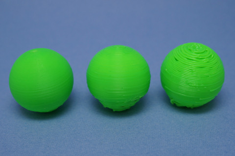 まずは積層ピッチを変えて直径2cmの球を出力、左から 0.1mm、0.2mm、0.4mm